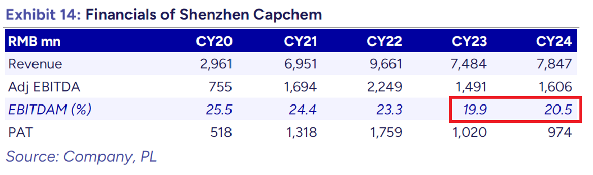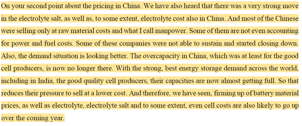 Management indicated that pricing in China is stabilizing/firming up. Previous low prices were unsustainable as suppliers were selling at raw material and labour cost, leading to plant shutdowns. Even in a report by PL Capital, EBITDA margins for one of the largest players in electrolytes (Shenzhen Capchem) increased in 2024.