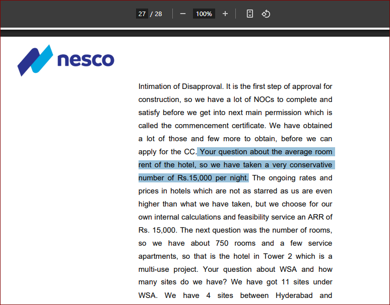 NESCO Realty IT park: It is operating at full occupancy of 100% in tower 3 and tower 4, so unless tower 2 is completed there is little scope of increase in revenue from this segment.