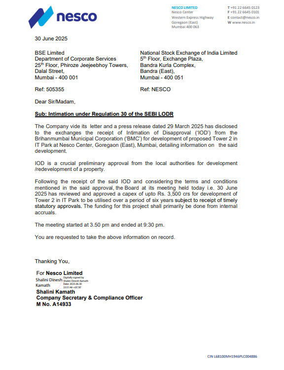 Board approved a budget of up to ₹3,500 crores to develop Tower 2 in their IT Park at Nesco Center in Goregaon, Mumbai. The funding will mostly come from the company’s own resources.