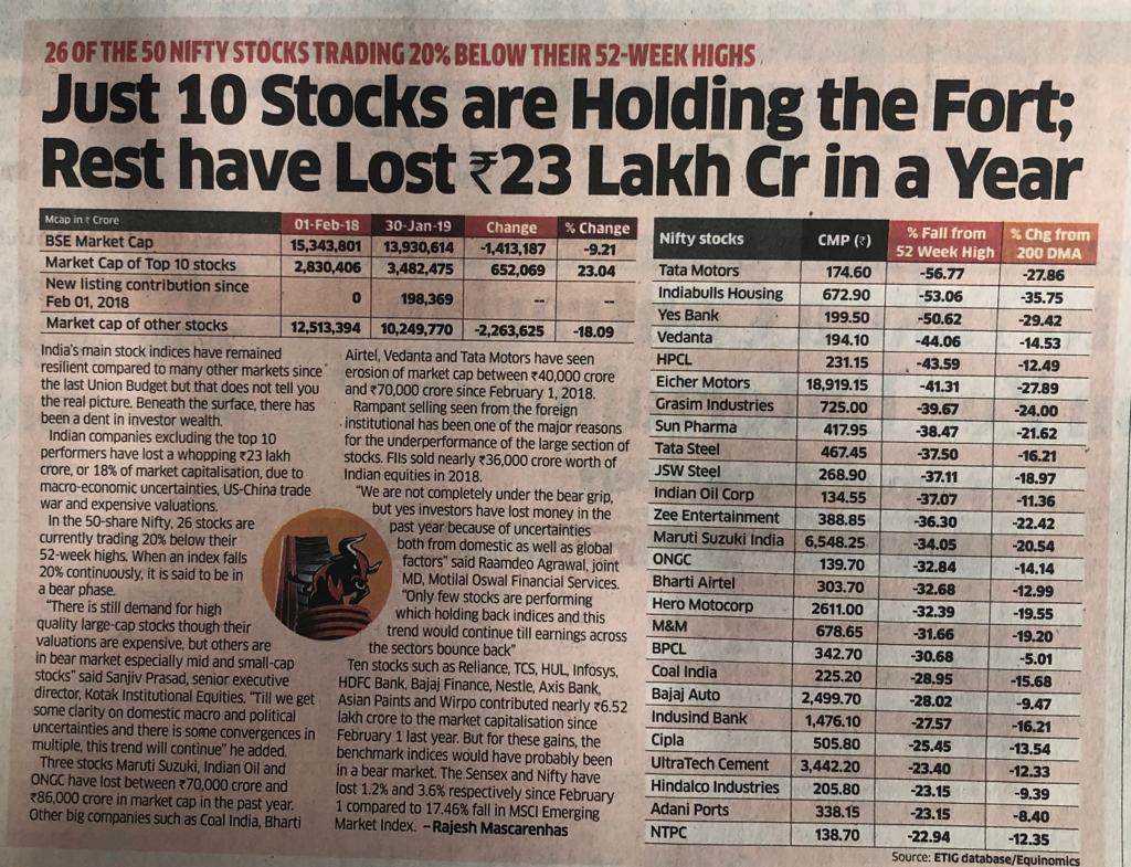 As an investor sitting on less than 10% equity allocation, I am extremely confused. On the one hand large cap stocks have barely corrected 10% (Nifty and Sensex) and trade at all time high trailing PEâs but on the other hand corporate earnings are at 15 year lows. Many largecaps seem to be making all time highs while a large number of broader market stocks seem to be making 52 week lows. While on P/B basis these stocks are on long term average on P/E basis many of these stocks are still expensive as compared to historical numbers. Despite small cap index crashing 35% retail participation and enthusiasm continues to remain unabated a phenomenon not seen very often.