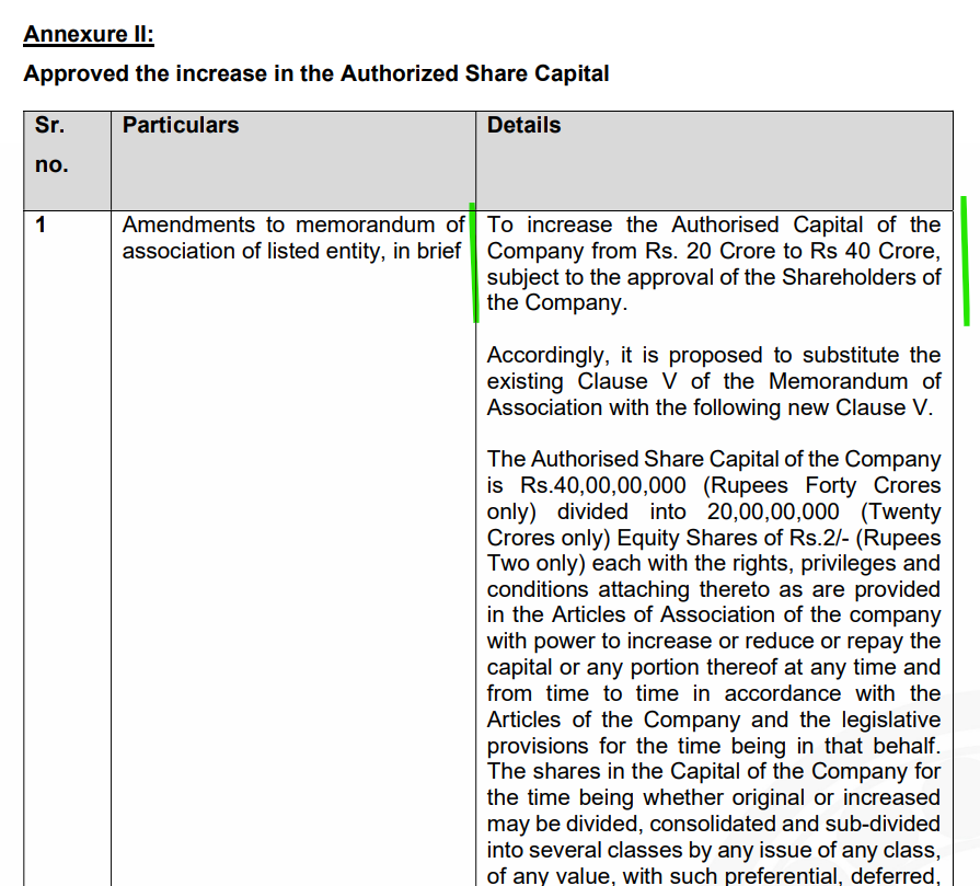 Increased authorized doesn’t mean promoter holding will go down. But it depends on the avenue they chose to raise the capital - QIP, rights issue or preferrential allotment. Also, there is no official communication about fund raising. Authorized share capital needs to accommodate if there is any new shares in future that is going to come. Only management can clarify on the reason for increased authorized capital. I am just taking some guess as to why management increases authorized share capital simply (May be some senior members can enlighten more on this topic)