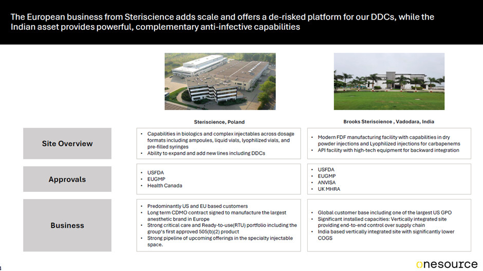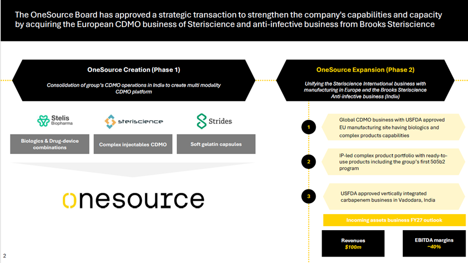 OneSource Specialty Pharma Limited (formerly Stelis Biopharma) is a specialty pharmaceutical Contract Development and Manufacturing Organization (CDMO), created through a strategic consolidation of soft gelatin, complex injectables, and biologics businesses from Strides Pharma Science and Steriscience.