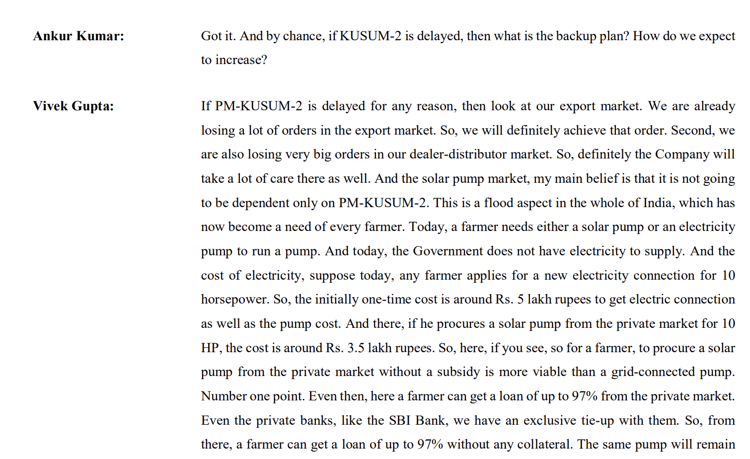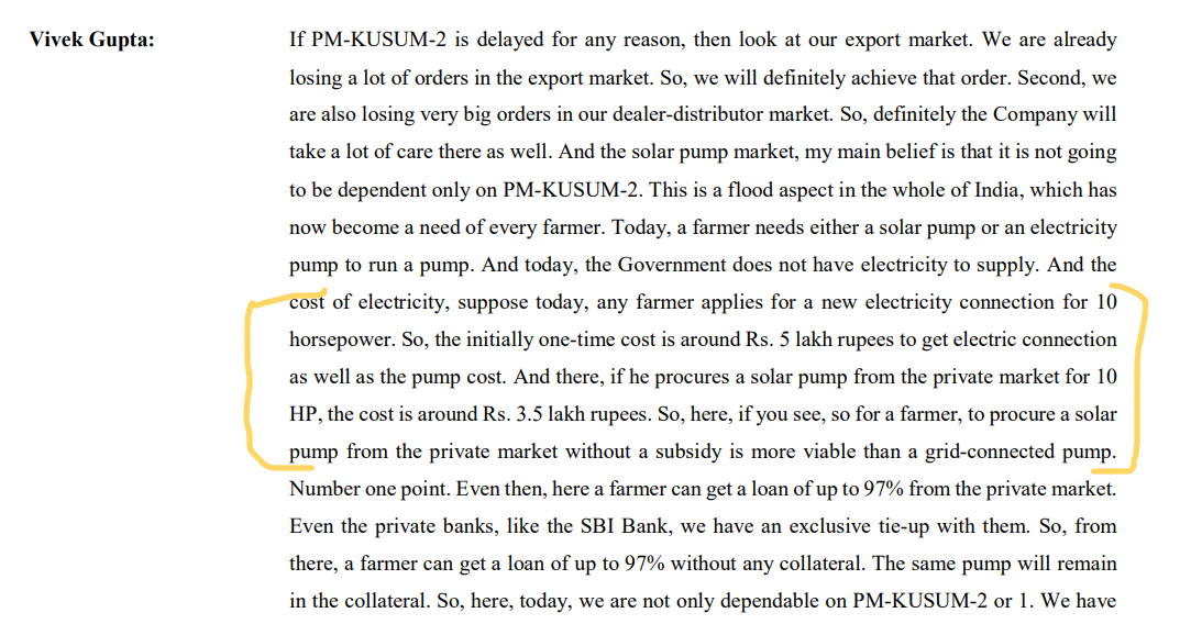 - Government is coming with Kusum 2.0 Yojana. It will be more aggressive and with more opportunities. First meeting for Kusum 2 was done on 25th April with Government. Company has 75-80% of revenue from Kusum Yojna. Government is working to make more smooth the payment terms and process in Kusum 2.0.