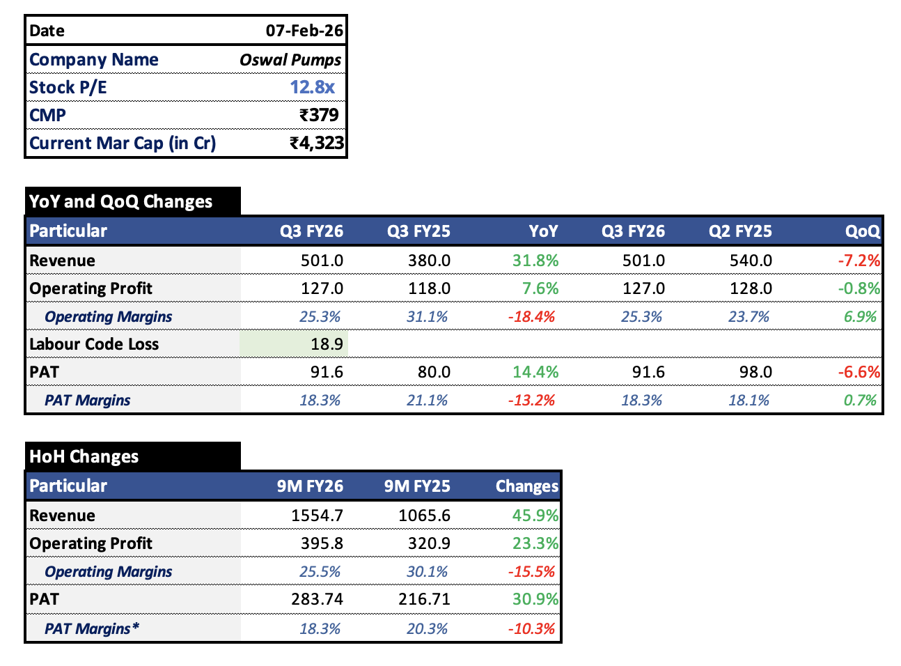 Good Results by Oswal Pumps in Q3, margins recovered strongly despite lower topline, hoping strong Q4 with good recent orders inflow.