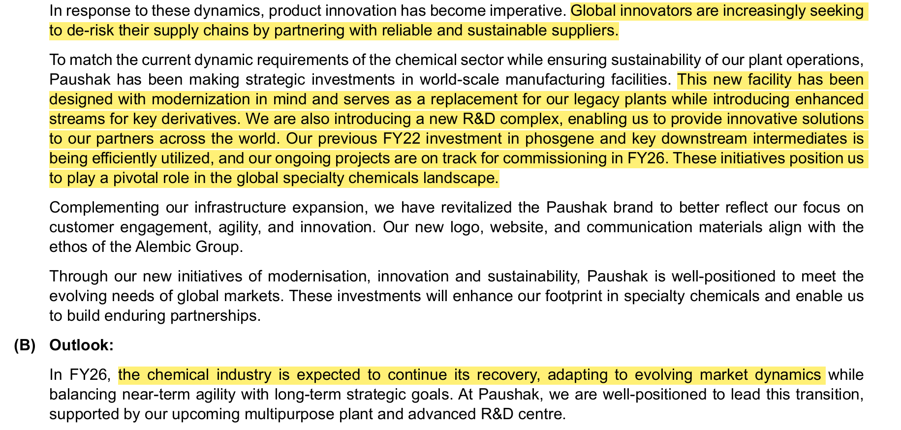 =These new automated plants have also been visited/audited by Global Customers/ Innovators from our targeted segments resulting in more confidence and interest in our technical expertise and is expected to result in future growth opportunities while establishing Paushak as serious global supplier for Phosgene derivatives.