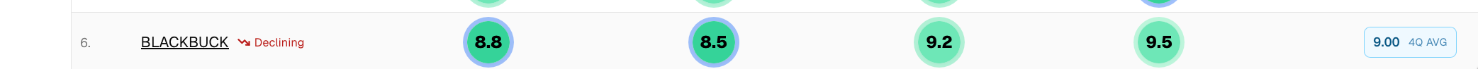 @imurlovish The declining pill tries to capture the trend of the quarterly score, comparing the latest score with the 4 qtr average. Since latest score(8.8) is less than 4qtr avg (9), the trend is declining