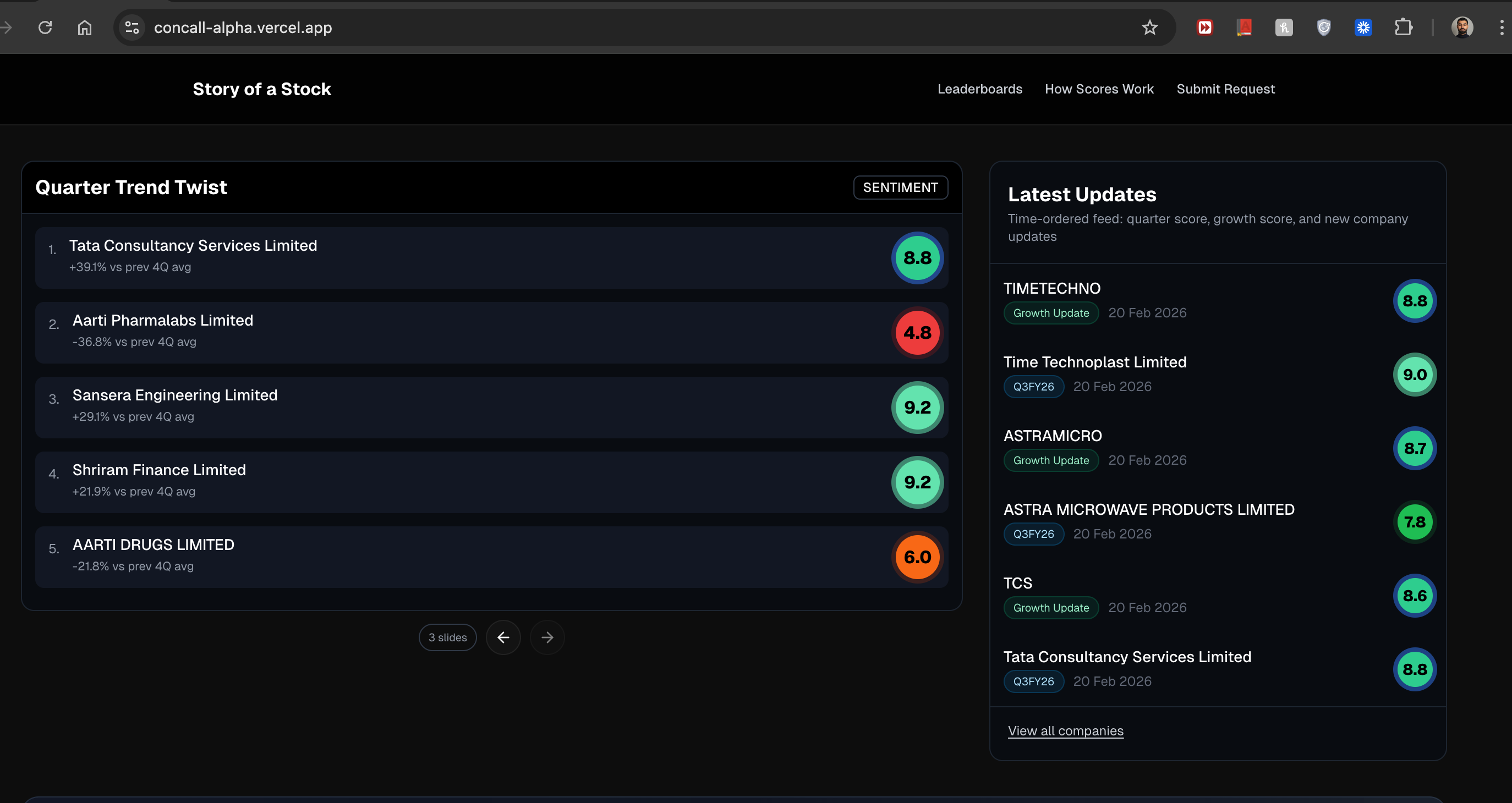 It converts dense concall/disclosure text into crisp, structured insights with a scoring framework to track what is improving, weakening, or changing.
