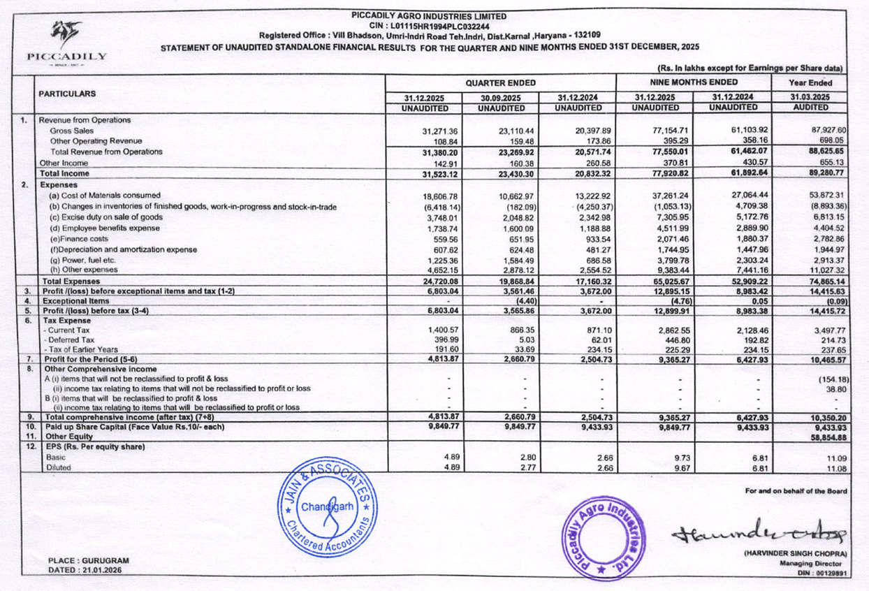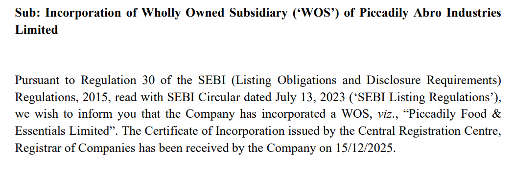 Piccadily agro incorporated a wholly owned subsidiary in the food sector as mentioned in the exchange filing.