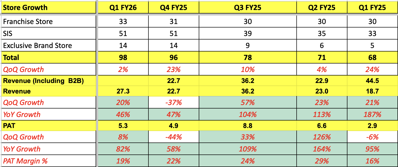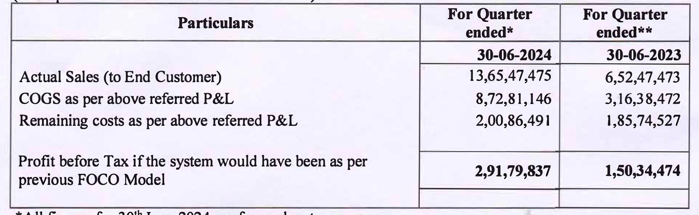 Earlier Gargi used to give inventory to PNG & Sons and only account for revenue which was sold to customers, Which FOCO model, in Q1 FY24, Company changed to FOFO model where they will just sell the inventory to PNG & Sons and account as revenue. So one time there was a large inventory sold in Q! FY24 (Whatever was lying with them) and after than PNG & Sons will keep ordering whatever is being sold to customer. Hence Q1 FY24 has one time B2B sales & profit numbers in P&L.