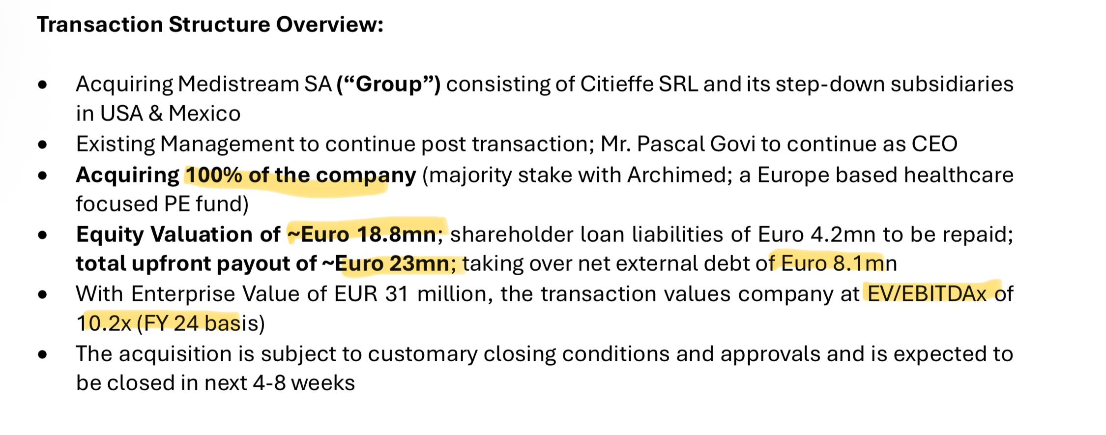 Yeah unlike any other industry medtech has high gross margins which lets them to acquire European businesses and continue the operations.for example their italian subsidiary which I guess they acquired in 2019 now does73.93 crore revenue(ending 31 dec).so their new acquisitions in Europe atleast won’t face losses in my opinion.so downside is very limited for polymedicure if they fail.
