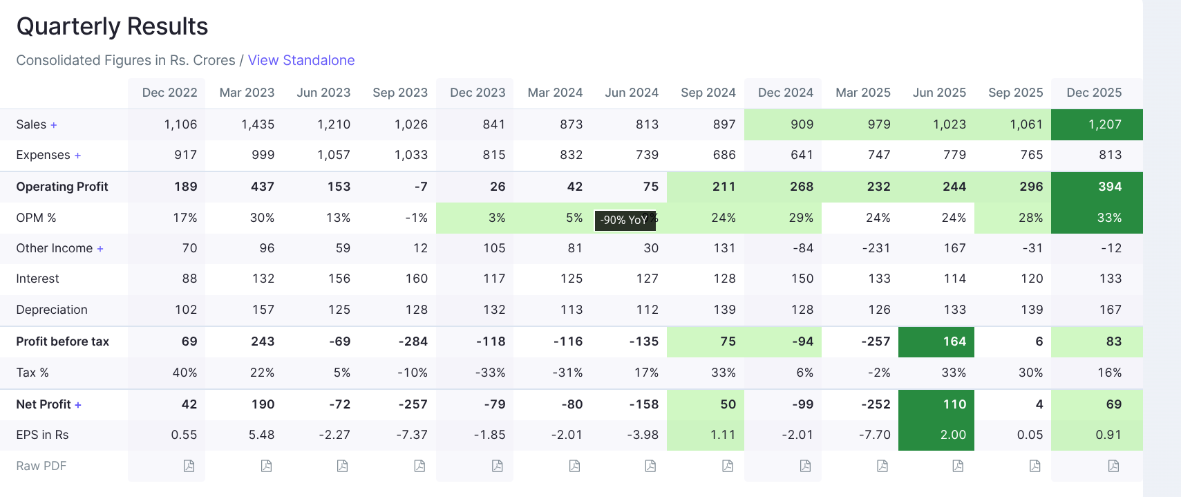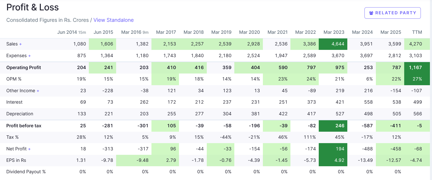 Interest expense remains very high at ~₹499 Cr TTM, consuming most operating profit.
