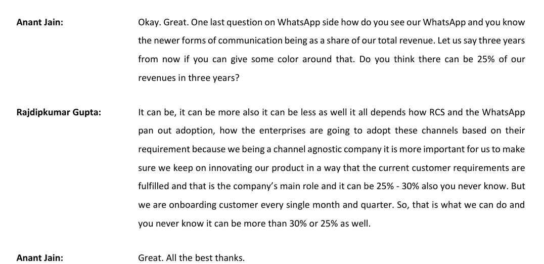 Its clear seeing numbers of most of the Cpaas players that A2P sms market is declining rapidly and since it forms majority of the revenue of most of them there is no visible growth since last many qtrs. But whats interesting to see is almost all are reporting 20-30% growth in newer forms of communication like whatsapp RCS etc.