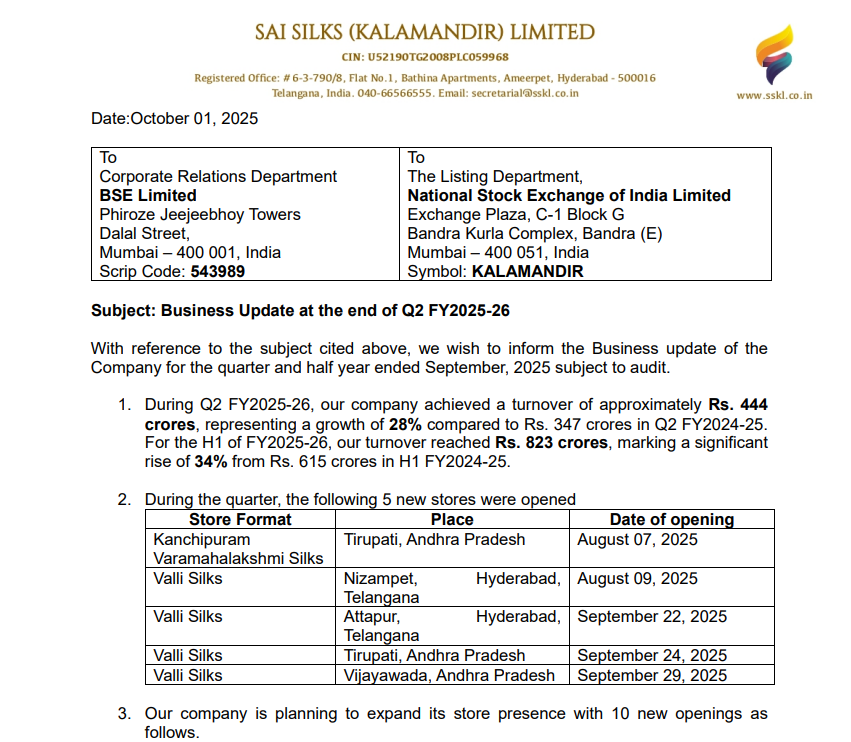 Company has started new format stores - VALLI SILK - is targeted towards lower priced silk sarees aiming at mass mkts. Valli Silk stores shall be smaller stores ( say about 5-6k Sq Ft vs 12-18k sq ft for Kalamandir stores ), focus on pocket friendly ranges of women wear + fashion items. Have converted few of their existing stores into VALLI format stores taking the total no of VALLI stores to 7 ( opened 4 stores in Q2 + converted 3 stores to this format )