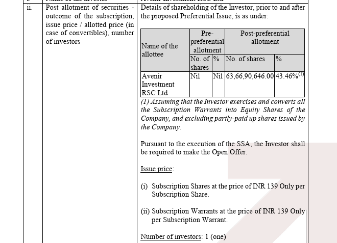 Board meeting details are out. Preferential issue of equity shares and warrants is being made to new investor (Avenir Investments RSC Ltd- Part of IHC). New investor will hold 43.4% of the entity and this will be a primary infusion.