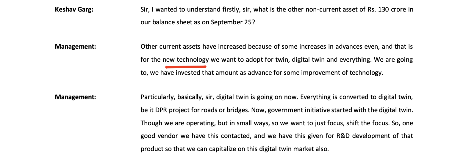 I could not understand what is meant by digital twin technology here, 130 crores are marked against this and given to a vendor as advances. This could be a bit alarming if the amount is not righty used and also its not clear if they will continue to spend more into this.
