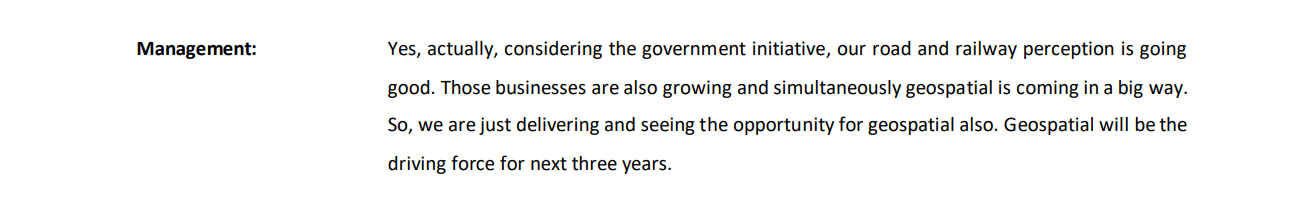 We will eagerly wait for your updates. Management was quite optimistic about Geospatial segment and you can dig more on the opportunity size and Monarch edge in this upcoming business