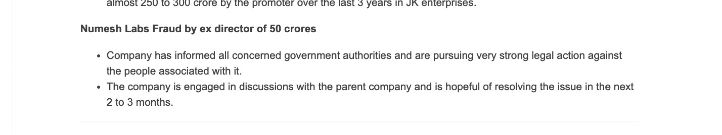 I am not sure what will be recovered in this, management says it will be recovered fully and no provision to be done. Stock didn’t react to this 50 cr fraud news when it was disclosed, market seems to be on the same page as management on the recovery.
