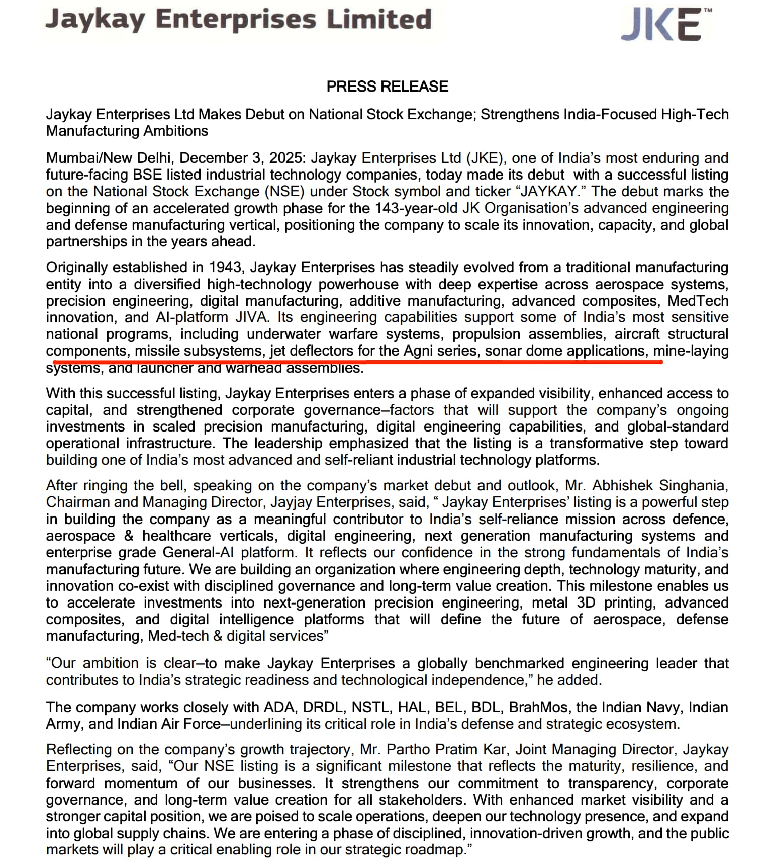 JAYKAY posted an update today as they listed in NSE exchange today.