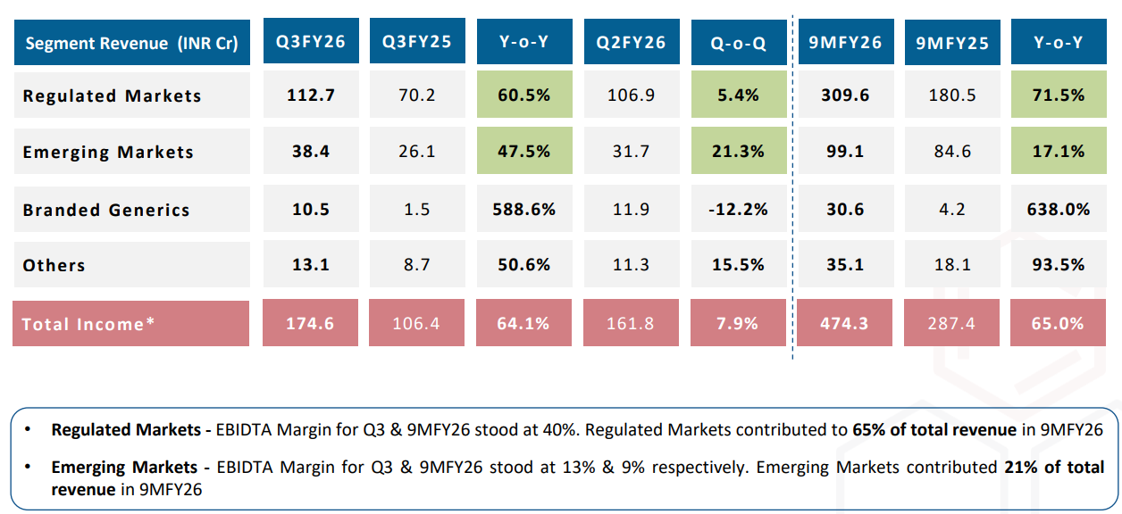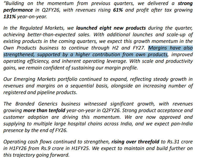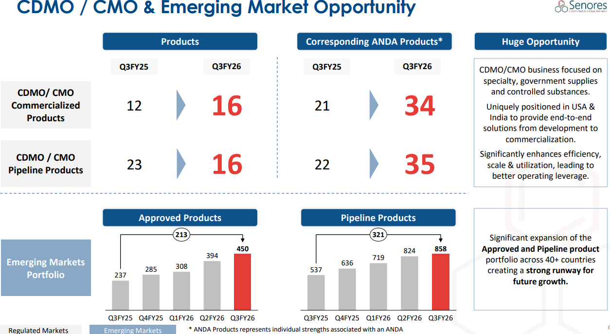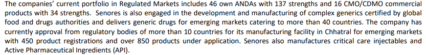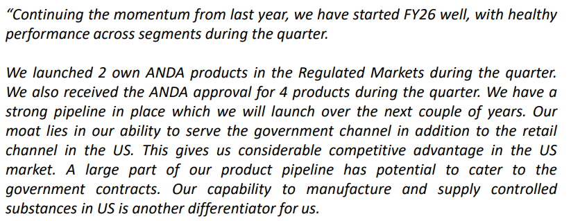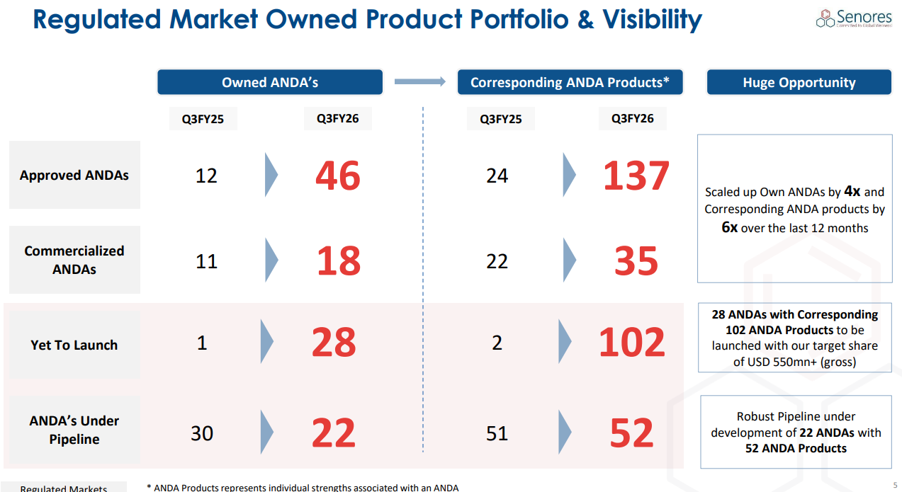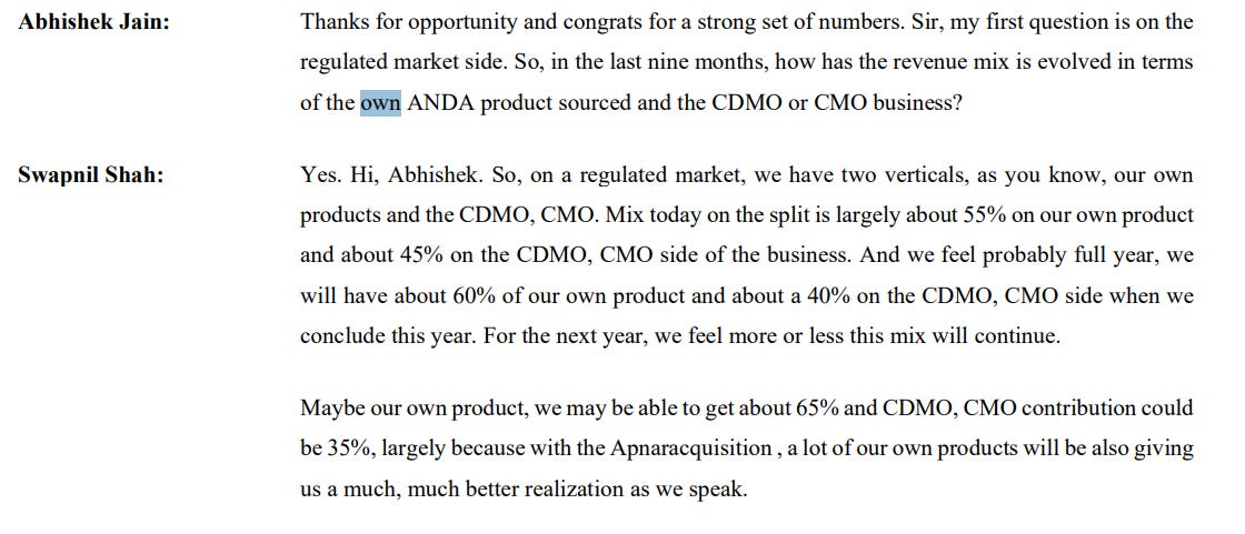 In regulated market, own ANDA products contributes to 55% of the revenue which has 4-6% more margin than CDMO/CMO, which will set to go to 60% in FY27.