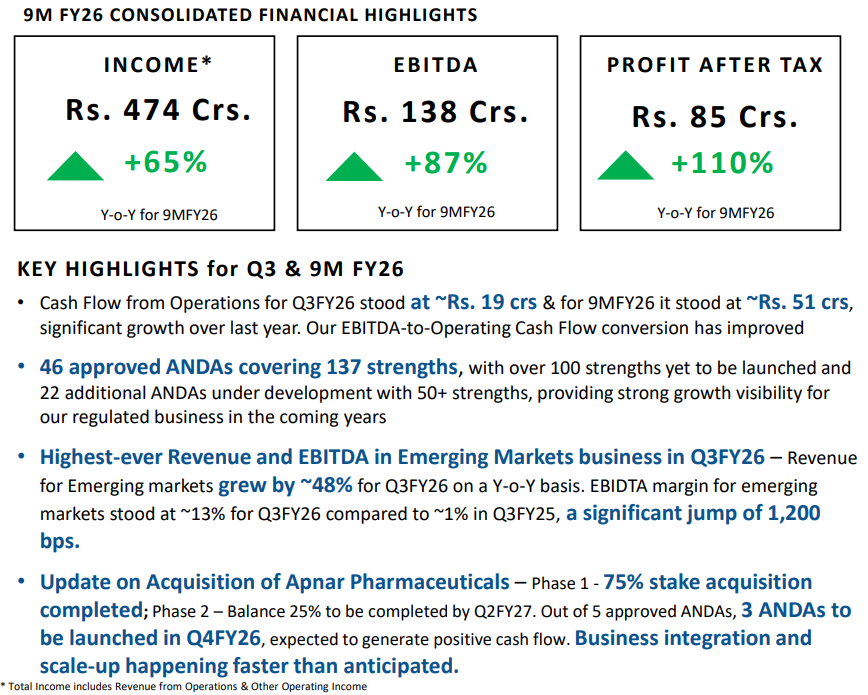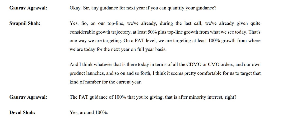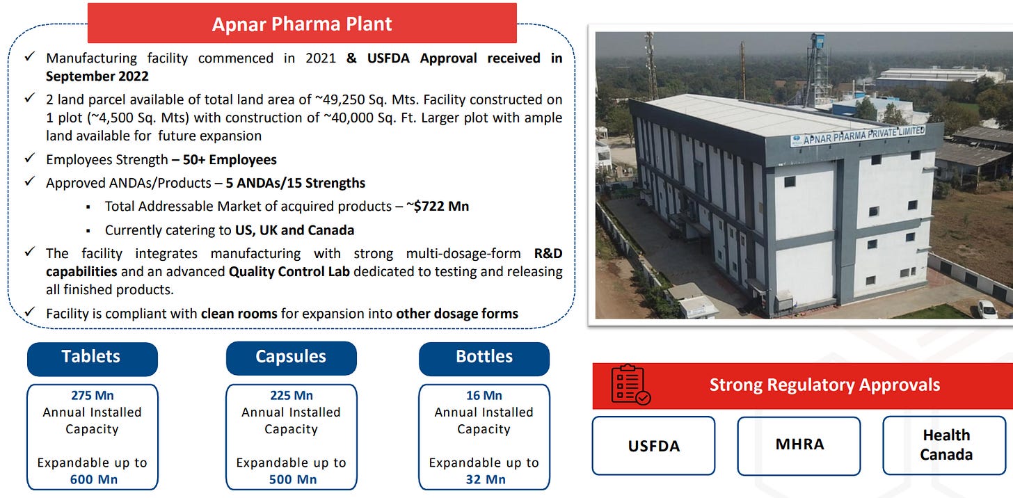 Another trigger came in on 15 Dec with the acquisition of “Apnar Pharma” at a enterprise value of Rs. 91 cr which came up with “an USFDA facility in Gujarat (commissioned in FY22), one plant in USA, has 5 ANDAs”- can get 100 cr revenue in FY27 with 30% EBITDA, 250 cr in FY28.