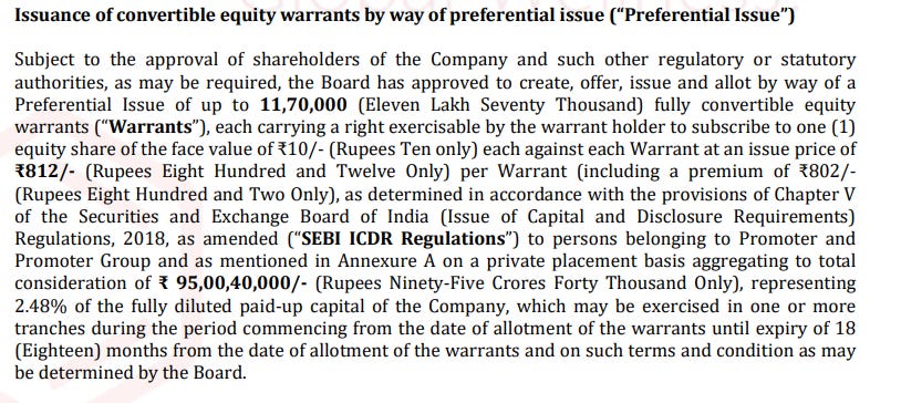 The management has issued warrents worth Rs. 92 crores by preferential issue at a price of Rs. 812 to for product acquistion and working capital requirement