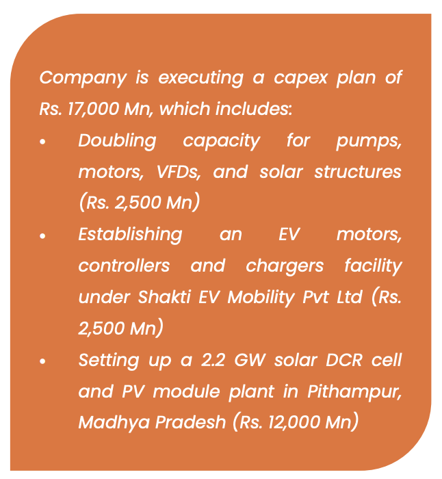 - Company has a capex plan of double the capacity of Pumps and motors and setting up greenfield Solar Cell and modules manufacturing capacity of 2.2 GW which will be start producing by March 2027.