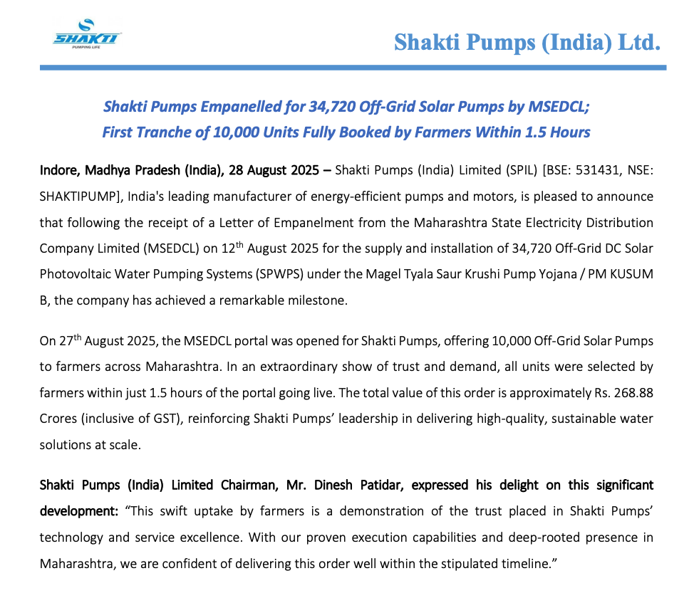 This Letter of Empanelment which means Shakti Pumps can take part in this order of 1037 Cr but not sure how much will be supplied by Shakti only. This gives the visibility for more order inflow by as per the biding system it’s upto Farmers who will select the vendor from whom they want to purchase.