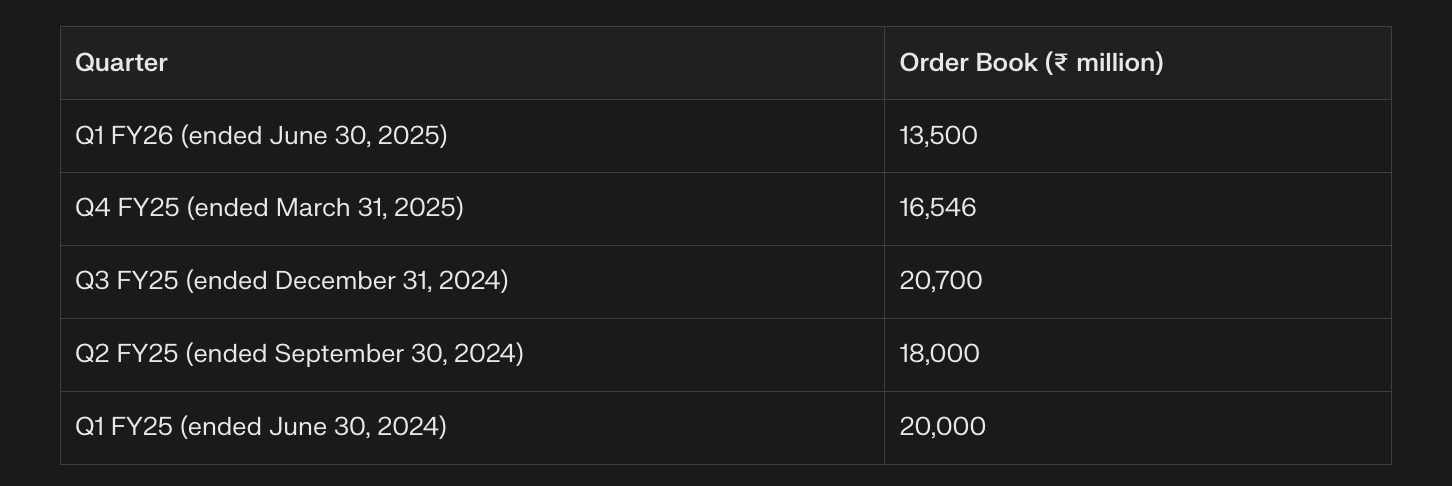 Orderbook at end of every quarter for last 5 quarters. Currently at 1350 cr. Roughly 2.2 times of quarterly revenue