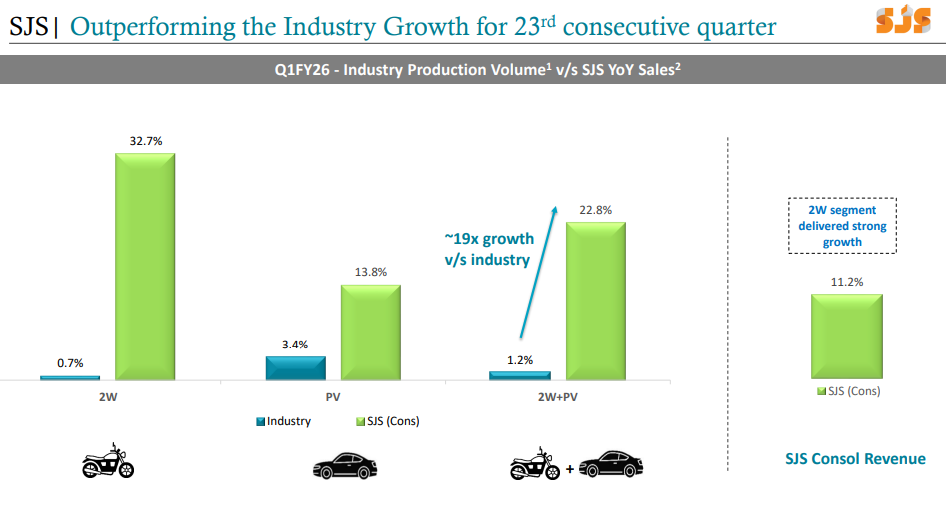 SJS Enterprises has outpaced the auto industry for 23 consecutive quarters. In Q1 FY26, whereas the 2-wheeler industry recorded just 0.7% growth, SJS reported 32.7%. In passenger vehicles, its growth was 13.8% compared to the industry’s 3.4%. On a combined 2W+PV basis, SJS recorded 22.8% growth compared to the industry’s 1.2%, nearly 19 times greater. This good performance enabled the company to achieve 11.2% consolidated revenue growth with the 2W segment being the major contributor.