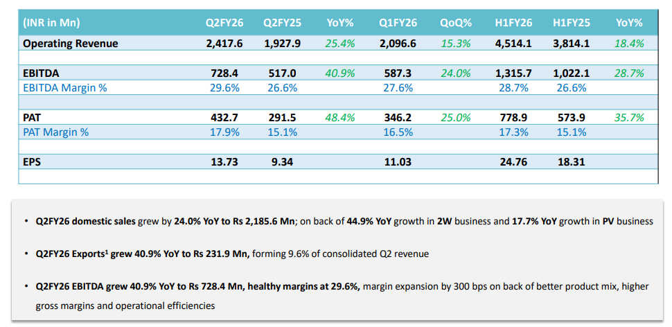 SJS Enterprises has outpaced the auto industry for 23 consecutive quarters. In Q1 FY26, whereas the 2-wheeler industry recorded just 0.7% growth, SJS reported 32.7%. In passenger vehicles, its growth was 13.8% compared to the industry’s 3.4%. On a combined 2W+PV basis, SJS recorded 22.8% growth compared to the industry’s 1.2%, nearly 19 times greater. This good performance enabled the company to achieve 11.2% consolidated revenue growth with the 2W segment being the major contributor.