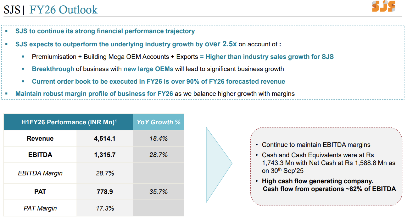 The Q1 FY26 results of SJS Enterprises illustrate how a mid-cap auto ancillary company applies financial discipline and strategic foresight to drive long-term value. 11.2% Y-o-Y revenue growth, coupled with 27.6% and 16.5% EBITDA margins and PAT margins, respectively, reflects pricing power and judicious cost management. Prudent leverage management is reflected in the net cash balance of INR 1,311.4 million. Both ROCE at 29.5% and ROE at 19.1% indicate good capital allocation, as would be the case with value creation sustained in the long term if returns are more than the cost of capital.