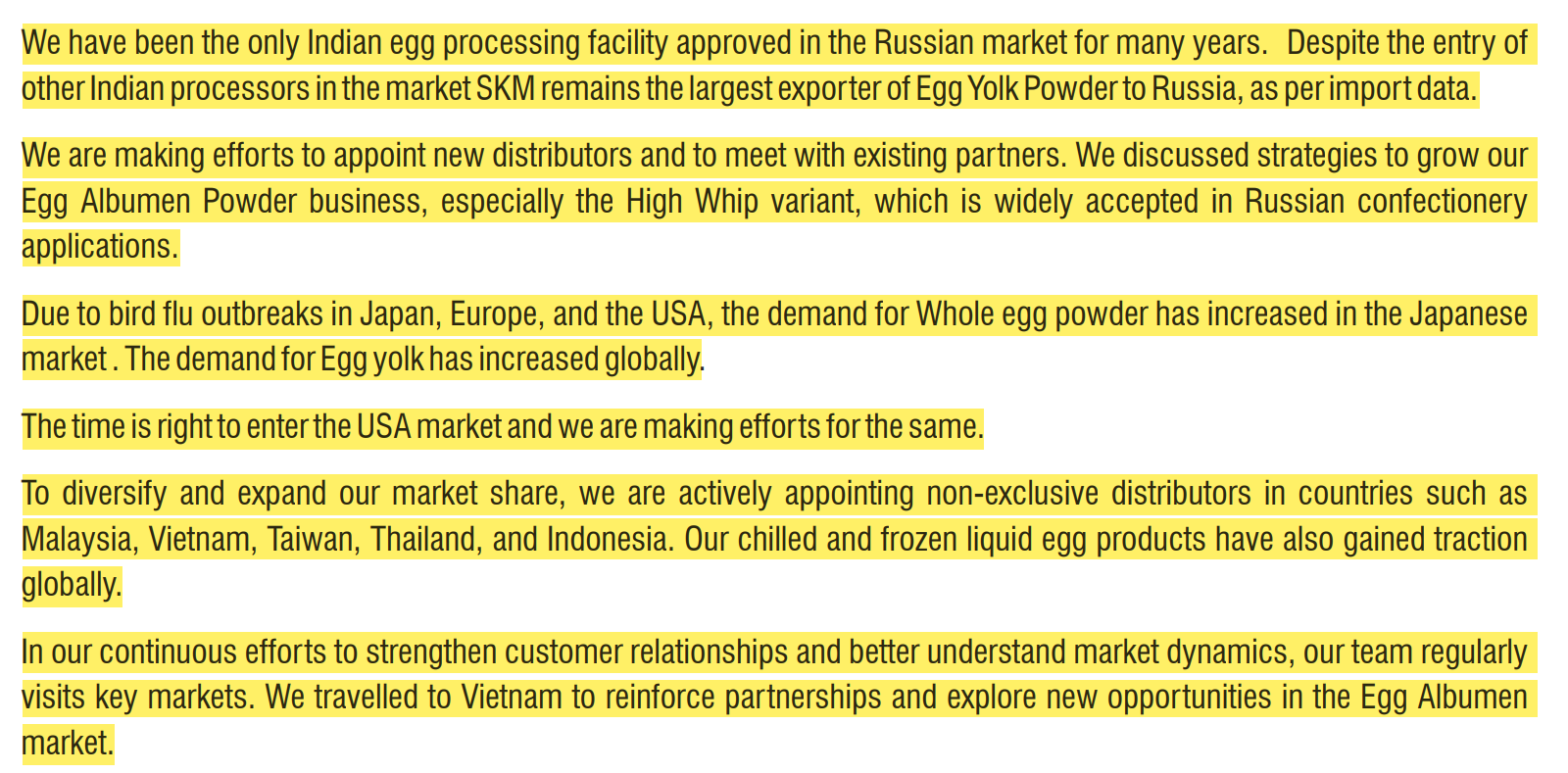 Russia / Japan and Europe are the top 3 places where they were exporting. Bird flu is a seasonal factor and happens every year. Is there anything specific / special that has impacted this company adversely this time? Best of my understanding, egg prices in US are up by ~50% in last 12 months. Don’t know how this is playing in SKMs exporting territories, but the probability of anything substantially different should be low.