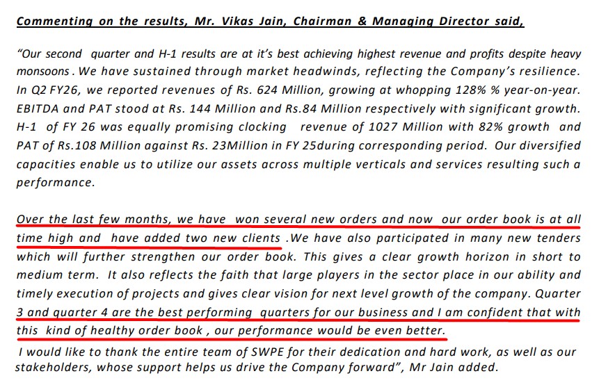 In the year 23-24 the company has won a copper mining project of Rs. 1,050 cr. The company has a 30% share in the JV. The entire contract is outsourced and it expects to provide a steady PAT of 2-3 crore every year.