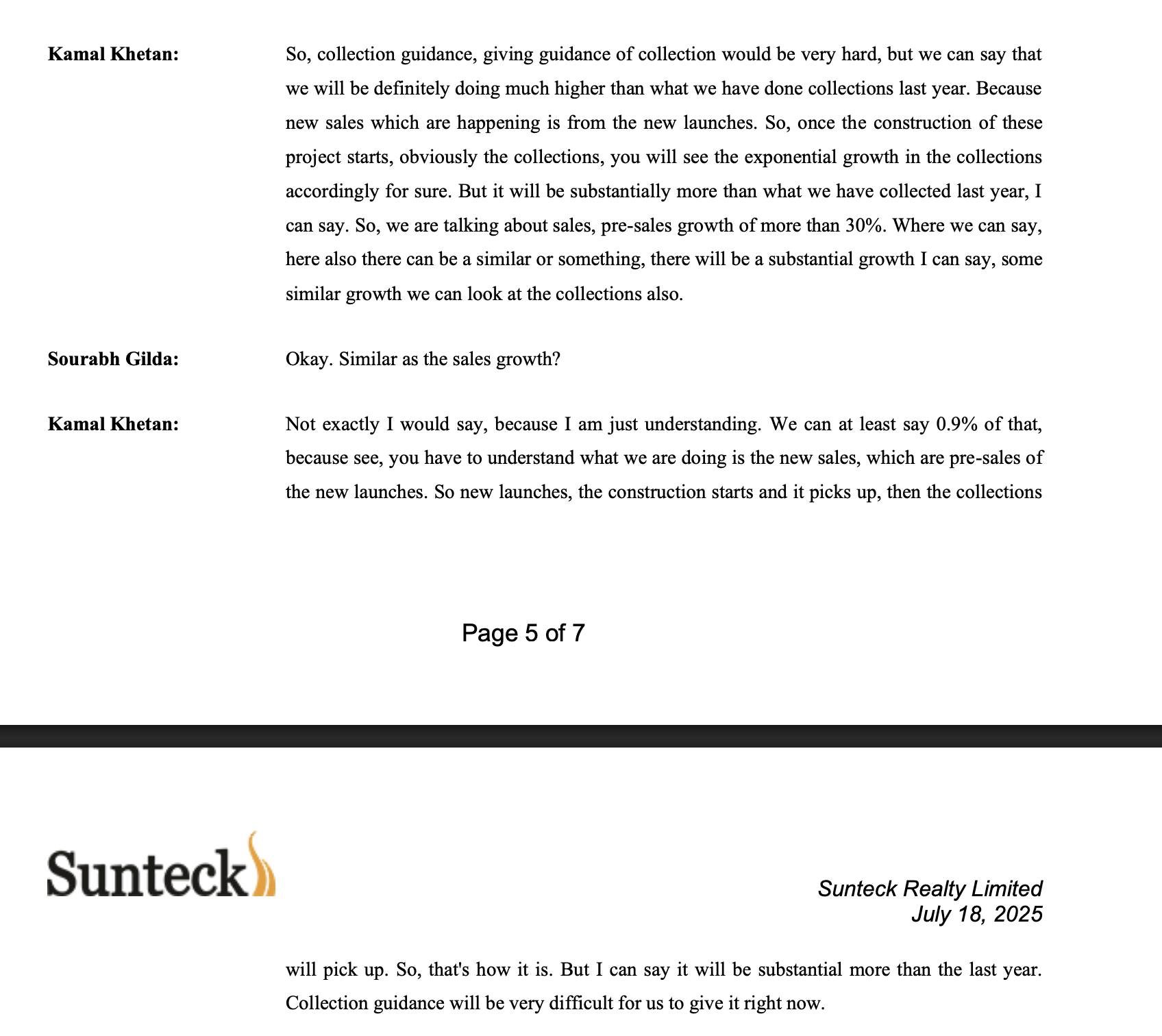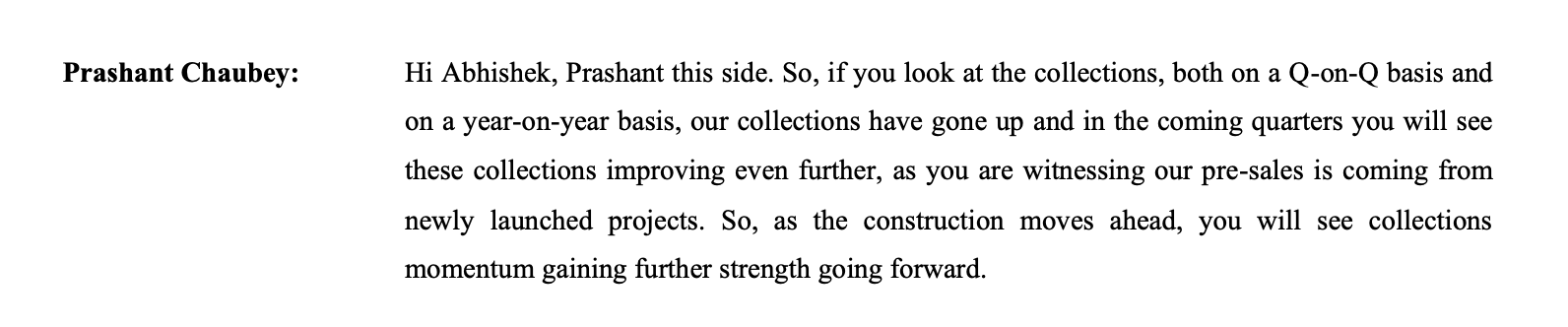 Not very convincing answer but management stated in Q1 FY 26 that collections should start getting picked up this year as sales from previous years start to contribute. To their credit pre-sales has grown 24% in Q2 FY 26 aligning with what they promised.