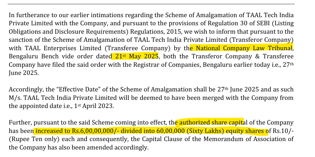 Finally after eternity, there is an Update on the Scheme of Amalgamation of TAAL Tech India Private Limited with TAAL Enterprises, NCLT sanctioned this on 21st May 2025, after 2+ years of wait. Bigger companies can get this completed in less than a year, but smaller companies it has been seen it usually takes1+ year, and for TAAL Ent it was very very long.
