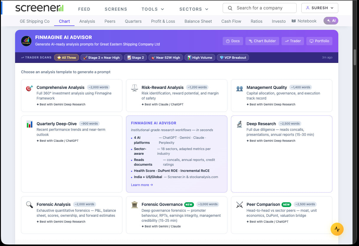 The extension auto-extracts all document URLs from Screener.in (concalls, ARs, credit ratings). When you click Generate, the AI receives a fully structured prompt with the company’s entire document library pre-referenced — it’s