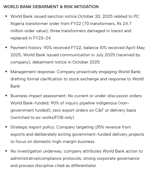 Management says there are no World Bank funded orders in the current order book or inquiry pipeline.
