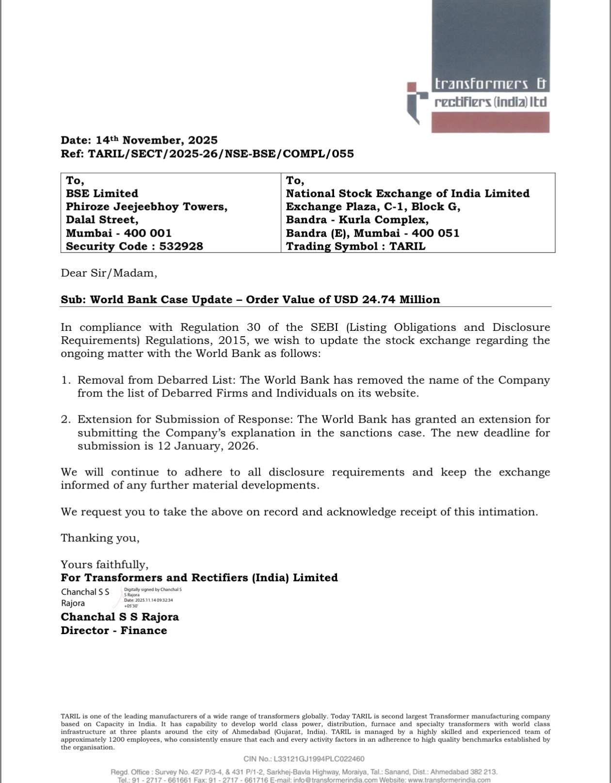 - Removal from Debarred List: The World Bank officially removed TRIL from its list of debarred firms and individuals on November 14, 2025. This interim relief potentially allows the company to participate in World Bank-funded projects again.