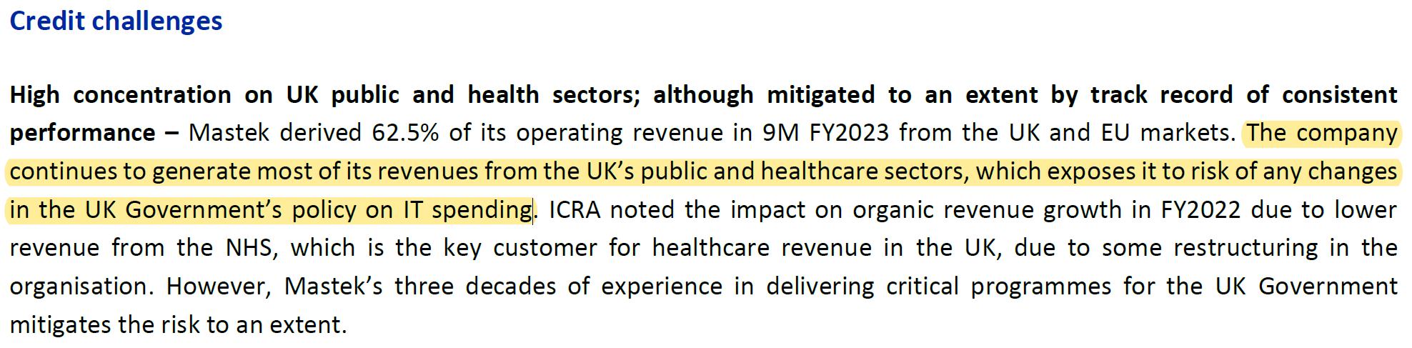 Mastek is an IT service provider that relies heavily on public sector clients from the UK and EU for business. Till 2022, 68% of the revenue was generated from the region, which the provider brought down to 62% by FY 2023. A credit rating report by ICRA highlighted the reliance on a specific geography and a specific industry as a challenge.