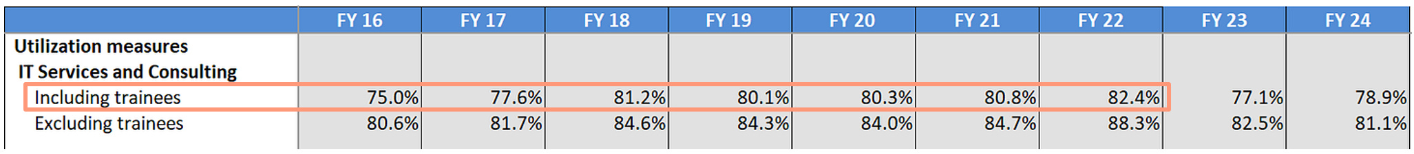 Infosys has shown good improvement in employee utilization from FY 16 to FY 22. The more recent utilization numbers are poor in comparison.