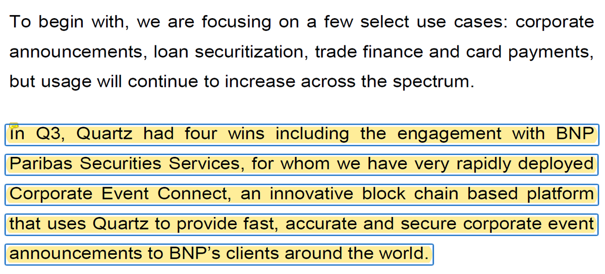 - TCS started experimenting with blockchain with a use case around non-critical business processes such as corporate announcements. It will gradually move to more critical processes like loan securitization, card payments, etc. Management noted they will leverage domain and contextual knowledge.