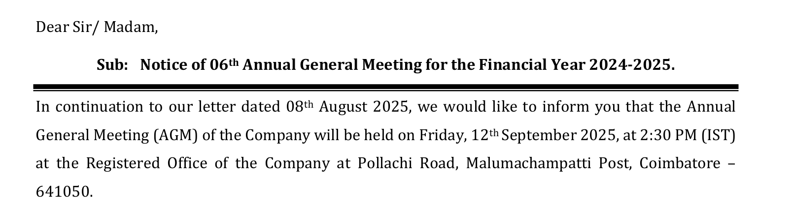 The Thirty Ninth Annual General Meeting (39th AGM) is scheduled to be held on Friday, August 22, 2025, at 10.30 a.m, at Brindhavan Auditorium, 1/443 A-1,Chinniyampalayam, Coimbatore-641062.