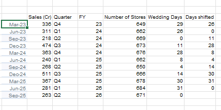 But essentially ~50% of the variation in sales can be attributed to the number of wedding days in the upcoming quarter (So people usually start shopping in the previous quarter is what I am implying here) and that seems to be a valid proposition by the company.