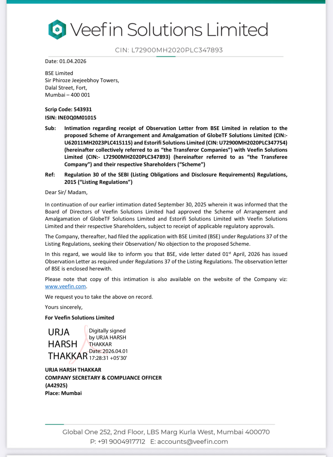 Veefin has received BSE’s no-adverse-observation letter for the proposed amalgamation of GlobeTF and Estorifi into Veefin. This is a positive regulatory milestone and allows the company to move ahead with the NCLT process. However, it is not a final approval—Veefin still needs to comply with SEBI/BSE disclosure conditions, shareholder/creditor requirements, and obtain NCLT sanction.