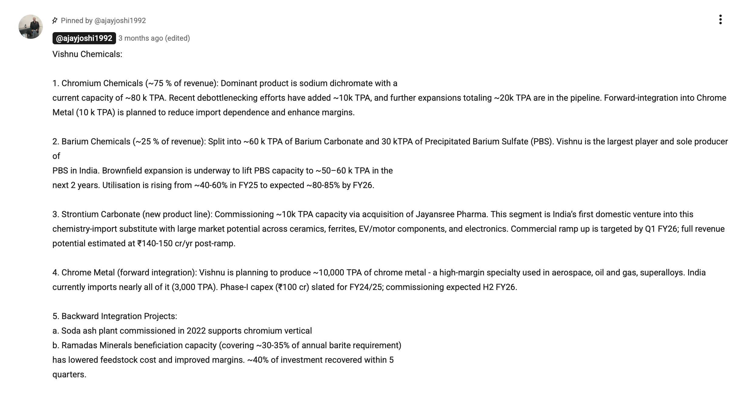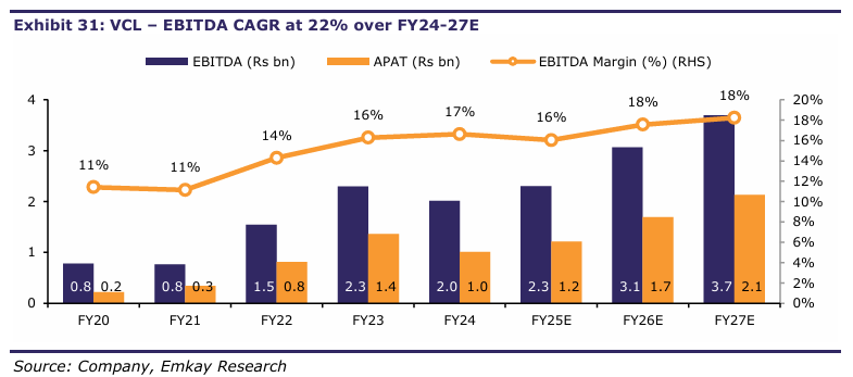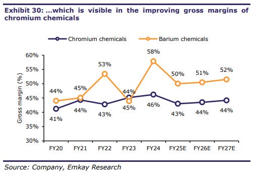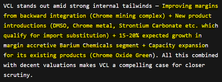 VCL stands out with strong internal tailwinds — Improving margins from backward integration (Chrome mining complex) + New product introductions (DMSO, Chrome metal, Strontium Carbonate etc. which qualify for import substitution) + 15-20% expected growth in margin accretive Barium Chemicals segment + Capacity expansion for its existing products (Chrome Oxide Green).