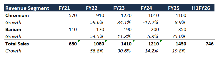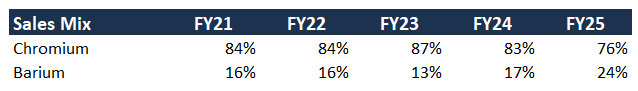 The Co’s revenue had grown at a fast clip except during FY24, when Chromium sales plunged 17% y-o-y, due to declining price realizations, softened export demand and increased chrome ore prices which the Co could only partially pass on.