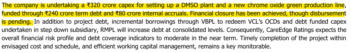 However, the same is expected to increase as the company is undertaking a ₹320 crore capex for setting up a DMSO plant and a new chrome oxide green production line, funded through ₹240 crore term debt and ₹80 crore internal accruals.