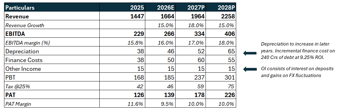 We don’t endorse the FY26 and FY27 estimates of 18% EBITDA margin provided by Emkay Research. As of H2 FY26, EBITDA margins were ~15.2%. For our forward projections, we will consider the EBITDA margins to increase at a more conservative pace.