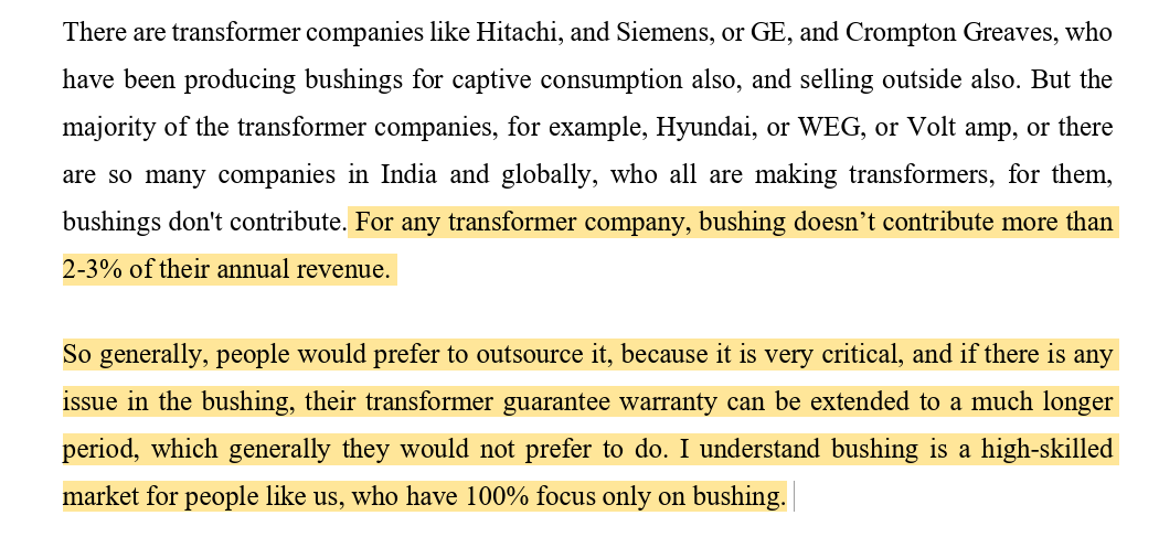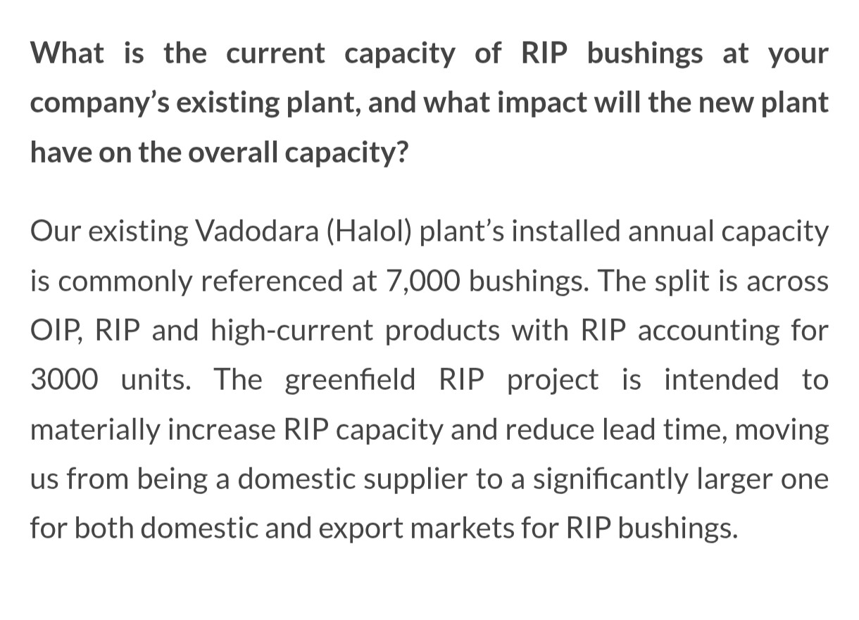 To sum up the above points, currently company is only exporting OIP bushings which represents only 5% overall. Majority sales come from RIP (higher premium than OIP) which is only sold domestically at present. They can’t export RIP because of license restrictions.