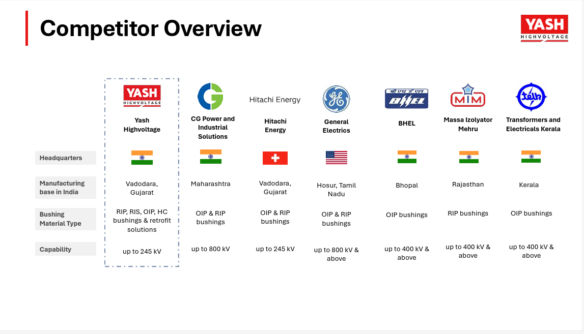 The company’s relationship with global giants like Hitachi and General Electric is nuanced. While these firms are significant market players, they primarily manufacture bushings for their in-house transformer production. Due to their own capacity constraints, they frequently purchase bushings from Yash, positioning them as both competitors and customers. This dynamic underscores Yash’s competitive cost structure and validated technical capabilities. As an Indian manufacturer, Yash enjoys a competitive pricing advantage over these global players, allowing it to capture market share while still generating strong margins.